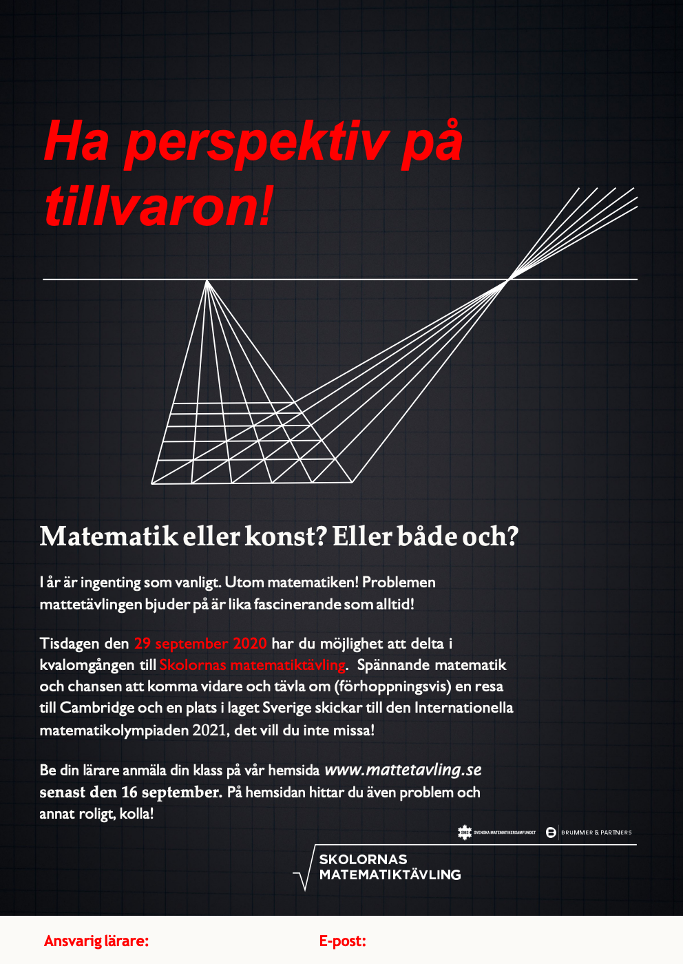 Nyheter Admin 2020-08-25 Admin 2020-08-25 Välkomna till Skolornas matematiktävling 2020/2021 Läs mer Admin 2020-06-14 Admin 2020-06-14 Resultaten från Nordiska matematiktävlingen 2020 Läs mer Admin 2020-05-29 Admin 2020-05-29 Lagfinalen 2020 Läs mer Admin 2020-05-11 Admin 2020-05-11 IMO-laget 2020 Läs mer Admin 2020-03-31 Admin 2020-03-31 Coronatider Läs mer Admin 2020-03-05 Admin 2020-03-05 Mats Boij: “Tävlingarna sporrade mig” Läs mer Admin 2015-08-04 Admin 2015-08-04 Blogg IMO 2015: 4 augusti Läs mer Admin 2015-07-14 Admin 2015-07-14 IMO 2015 är (nästan) slut Läs mer Admin 2015-07-09 Admin 2015-07-09 Blogg IMO 2015: 9 juli Läs mer Admin 2015-07-07 Admin 2015-07-07 Blogg IMO 2015: 7 juli Läs mer Admin 2015-07-07 Admin 2015-07-07 Blogg IMO 2015: Storseger för Sverige i Viking Battle! Läs mer Admin 2015-07-06 Admin 2015-07-06 Blogg IMO 2015: 5 juli Läs mer Admin 2015-07-03 Admin 2015-07-03 Blogg IMO 2015: 3 juli Läs mer Admin 2015-07-03 Admin 2015-07-03 Sveriges OS-lag på väg till Thailand Läs mer Admin 2015-07-02 Admin 2015-07-02 Blogg IMO 2015: 2 juli Läs mer Admin 2015-06-23 Admin 2015-06-23 Lisa Lokteva övar matte på stranden Läs mer Admin 2015-06-18 Admin 2015-06-18 Martin Hesselborn laddad inför OS Läs mer Admin 2015-06-17 Admin 2015-06-17 Nytt format för SMT:s lagtävling Läs mer Admin 2015-04-27 Admin 2015-04-27 Lag Sverige 2015 Läs mer Admin 2015-04-22 Admin 2015-04-22 Sverige överlägset bäst i Nordiska matematiktävlingen Läs mer Nyare inlägg Äldre inlägg